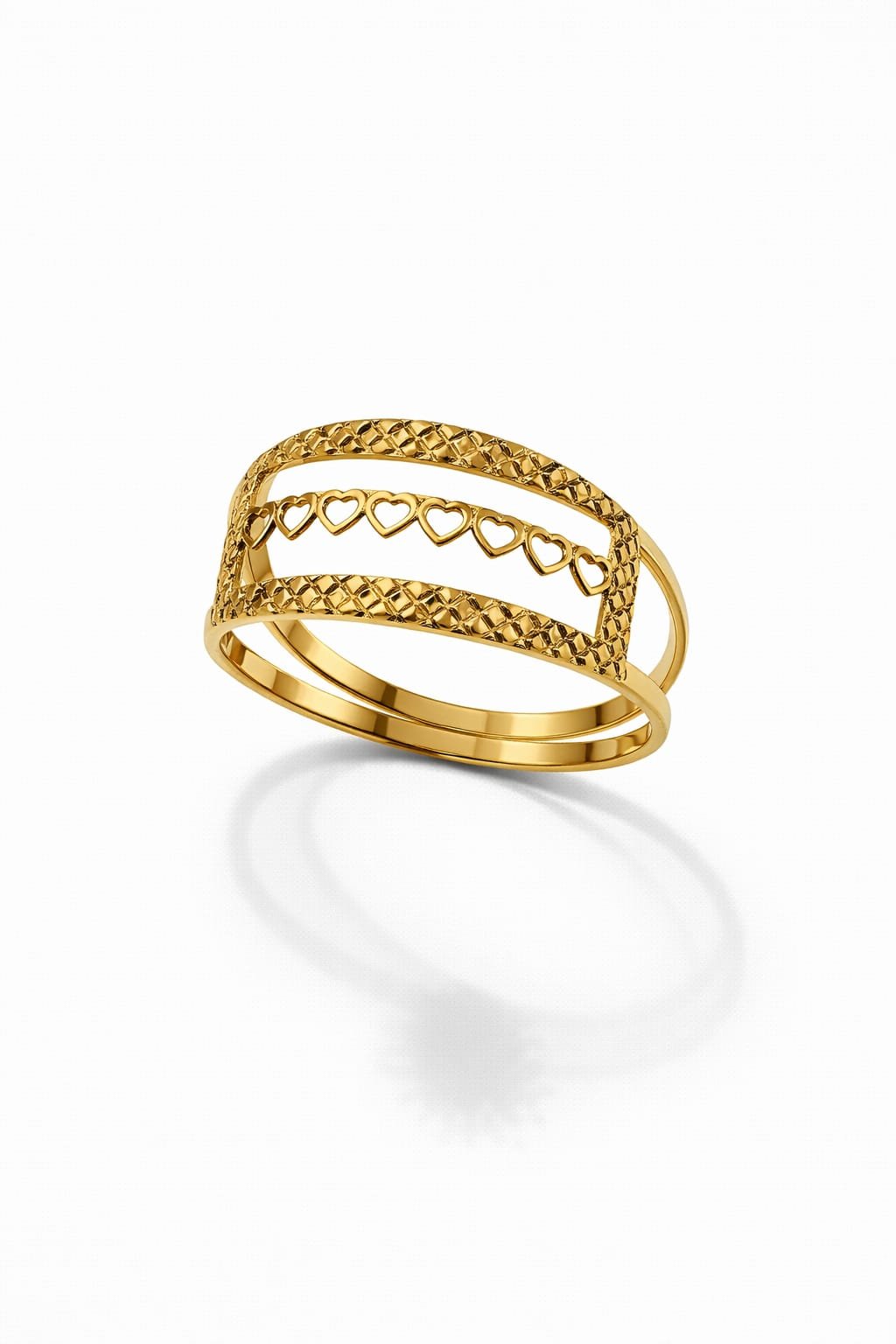 Um anel que celebra o amor em cada detalhe. Com design em camadas harmoniosas e uma delicada fileira de corações vazados, esta joia simboliza afeto, conexão e elegância atemporal.