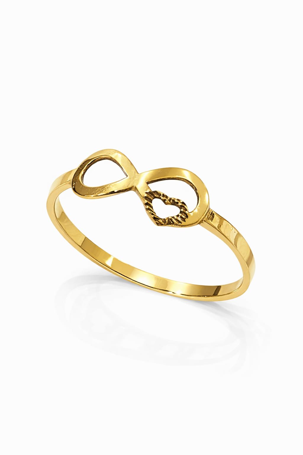 Anel infantil em ouro com design em formato de infinito integrado a um delicado coração central. Seu acabamento polido garante brilho intenso e um visual encantador, enquanto sua estrutura leve proporciona conforto para o uso diário.