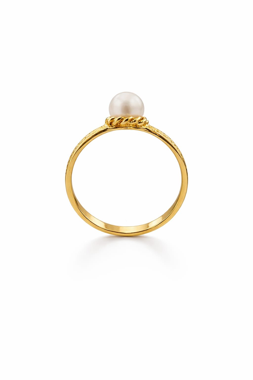 Anel infantil em ouro com aplicação de pérola central, criando um visual clássico e sofisticado. Seu design delicado aliado ao acabamento polido proporciona conforto no uso diário, além de destacar a beleza natural da joia com suavidade e brilho.