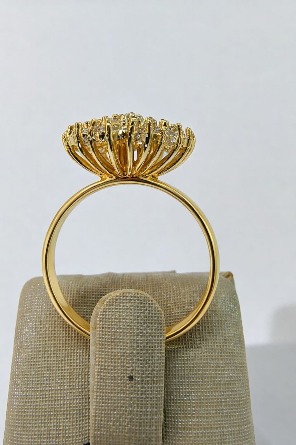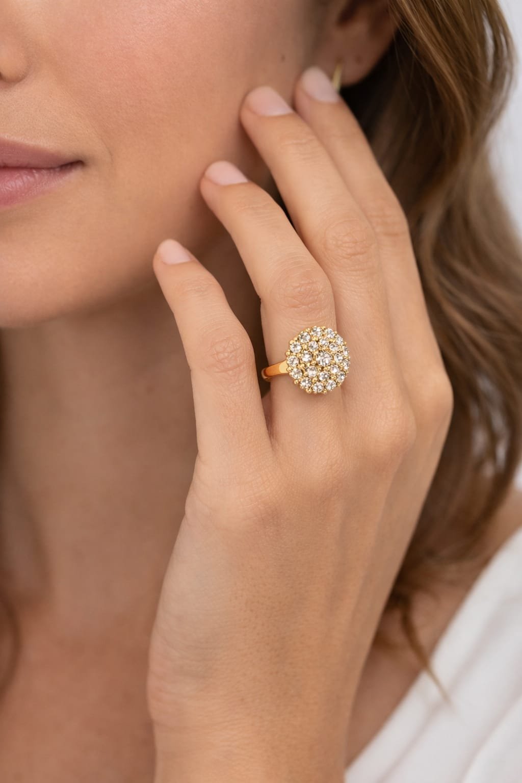 Anel em ouro com topo composto por múltiplas pedras cravejadas que formam um desenho volumoso e luminoso. O acabamento polido realça o brilho do ouro e das pedras, criando um efeito luxuoso e refinado. Uma joia pensada para quem busca presença e sofisticação.